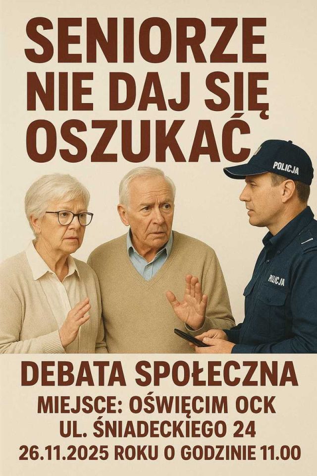Policjanci z Komendy Powiatowej Policji w Oświęcimiu we współpracy z Uniwersytetem III Wieku oraz Dziennym Domem Pomocy zapraszają na debatę społeczną Seniorze nie daj się oszukać. Spotkanie poświęcone będzie zagadnieniom związanym z ochroną osób starszych przed oszustwami oraz przestępstwami na szkodę seniorów.