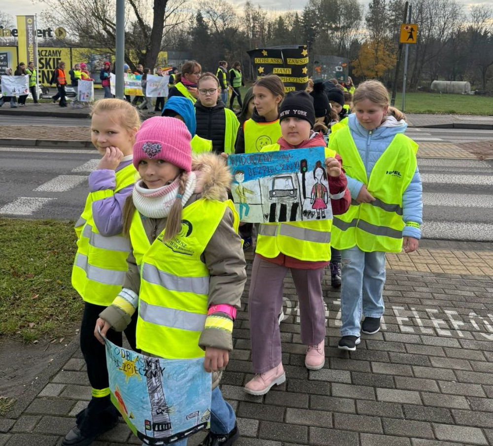Uczniowie i nauczyciele Szkoły Podstawowej nr 1 w Oświęcimiu przemaszerowali w kamizelkach i z transparentami promując noszenie elementów odblaskowych. Akcja odbyła się w ramach konkursu Odblaskowa szkoła, nad bezpieczeństwem czuwali policjanci.
