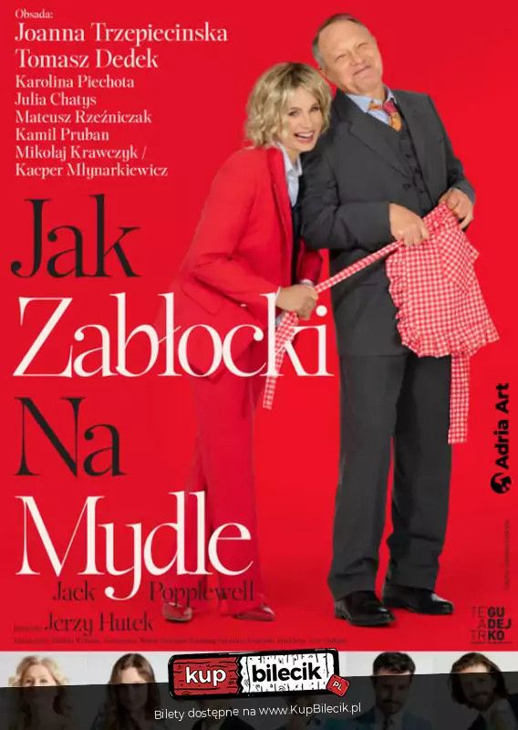 bilety: Pamiętacie Alutkę i Jędrulę? Joanna Trzepiecińska i Tomasz Dedek znowu razem! Dwoje wyjątkowych aktorów ponownie gra małżeństwo, które nie rozumie się od lat. Czy szalony eksperyment pomoże im to zmienić? Zapraszamy na komedię Teatru Gudejko, znanego z takich hitów jak "Nerwica natręctw", "Goło i wesoło" i "Berek, czyli upiór w moherze"! Jak wyjść bez szwanku ze zderzenia odmiennych potrzeb, ze stłuczki dwóch światów - kobiecego i męskiego? Jak wyślizgnąć się spod walca utartych schematów? Małżeństwo z długim stażem (Joanna Trzepiecińska i Tomasz Dedek) decyduje się na radykalny krok - zamianę ról! "Jak Zabłocki na mydle" to zwariowana komedia autorstwa Jacka Popplewella w brawurowej adaptacji i reżyserii Jerzego Hutka. To opowieść dla wszystkich, którzy kiedykolwiek marzyli o zrzuceniu jarzma codziennych stereotypów. Chcesz się przekonać, kto na tym wszystkim wyjdzie jak przysłowiowy Zabłocki na mydle? Ruszaj śmiało do teatru i przekonaj się na własne oczy! Sprawdź repertuar występów i zarezerwuj bilety. Jak Zabłocki na mydle - spektakl komediowy artyści: Joanna Trzepiecińska, Tomasz Dedek, Julia Chatys, Kamil Pruban, Karolina Piechota i inniAlutka i Jędrula znowu razem! Dwoje wyjątkowych aktorów ponownie gra małżeństwo, które nie rozumie się od lat. Czy szalony eksperyment pomoże im to zmienić? Jak wyjść bez szwanku ze zderzenia odmiennych potrzeb, ze stłuczki dwóch światów - kobiecego i męskiego? Jak wyślizgnąć się spod walca utartych schematów? Małżeństwo z długim stażem (Joanna Trzepiecińska i Tomasz Dedek) decyduje się na radykalny krok - zamianę ról! "Jak Zabłocki na mydle" to zwariowana komedia autorstwa Jacka Popplewella w brawurowej adaptacji i reżyserii Jerzego Hutka. To opowieść dla wszystkich, którzy kiedykolwiek marzyli o zrzuceniu jarzma codziennych stereotypów. Chcesz się przekonać, kto na tym wszystkim wyjdzie jak przysłowiowy Zabłocki na mydle? Ruszaj śmiało do teatru i przekonaj się na własne oczy! Bilety do nabycia na: KupBilecik.pl |